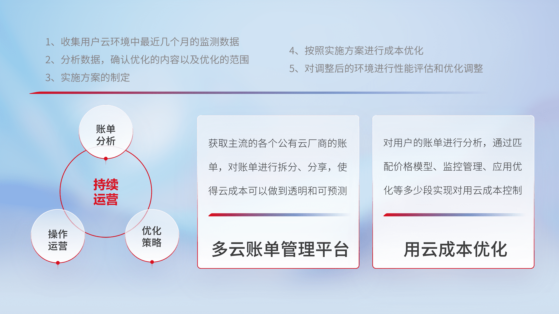 通过多云纳管,,,以统一的资源数据模型把客户的云资源进行抽象和封装,,,进而实现对多云资源的统一操作,,,保障云资源管理的可靠性、、稳定性与可用性。。。。量身定制化运维内容,,,配置、、、开发运维、、补丁管理、、、备份、、监控、、认证和访问管理、、、审计和日常巡检等,,,,保障在用云过程中的可靠度,,稳定度以及高可用率。。。。